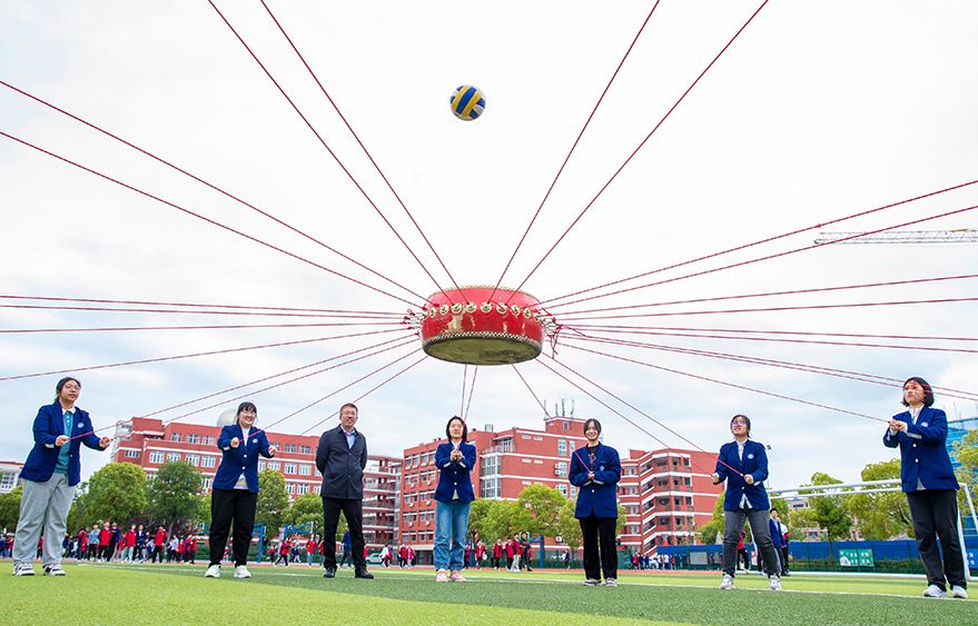 2023年5月7日,江苏省海安市曲塘中学高三学生在操场上玩“同心鼓”游戏。(图片来源:中新社)