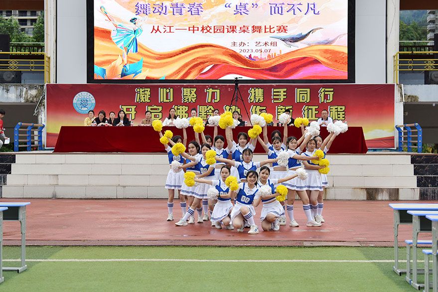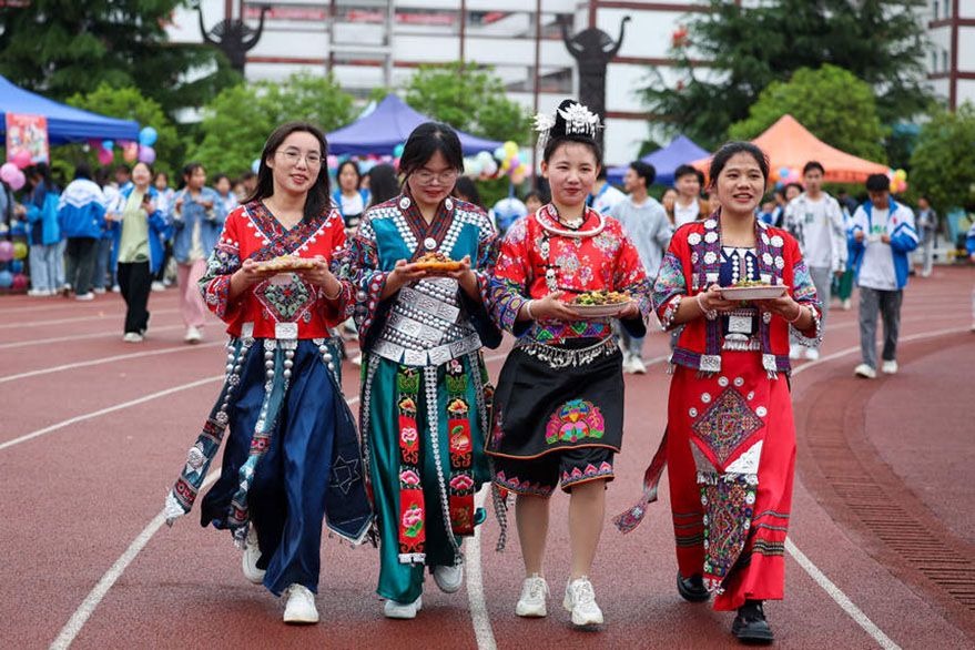 5月7日,学生在贵州省从江县第一民族中学操场表演舞蹈。(图片来源:中新社)