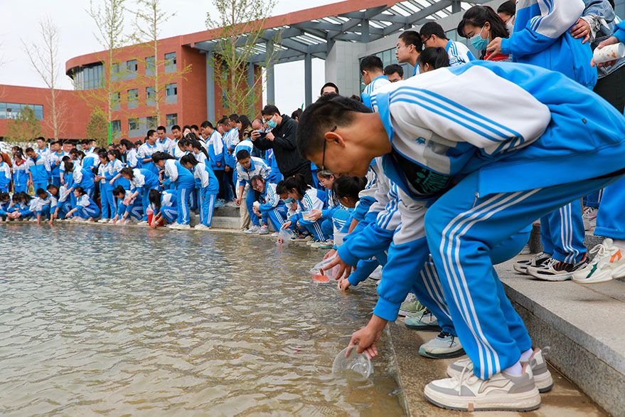 2023年5月7日,甘肃省酒泉市金塔县中学举行“祝福·圆梦·传承”高考励志“鲤鱼跃龙门”放锦鲤活动,用美好的寓意为高三学子加油。(图片来源:中新社)