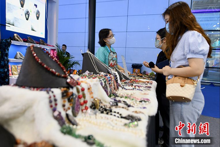 印尼馆中,印尼参展企业现场展示珠宝首饰、调味酱料、民族服装、传统工艺品等印尼特色产品。图为印尼手工艺品受青睐。(图片来源:中新网)