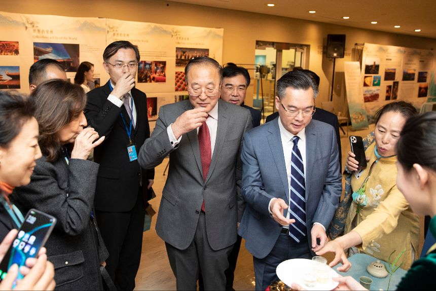 5月19日,中国常驻联合国代表团、中国文化和旅游部、泉州市人民政府在纽约联合国总部联合举办“茶和天下·雅集”主题展览和招待会。图为与会嘉宾品茶。(图片来源:中新社)