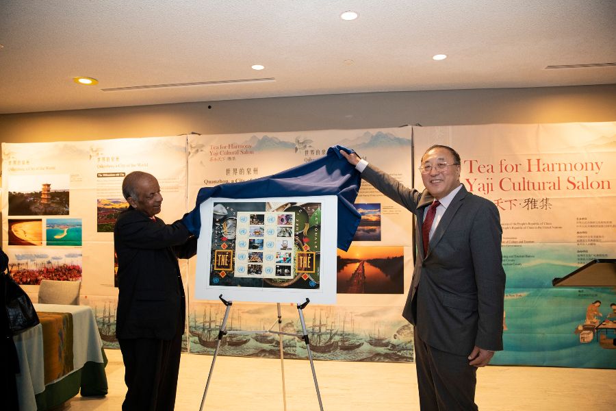 中国常驻联合国代表张军(右)与联合国副秘书长哈雷共同为联合国“国际茶日”主题邮票揭幕。(图片来源:中新社)