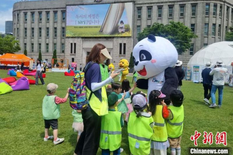 熊猫人偶和现场观众合影。(图片来源:中新网发/首尔文化中心供图)