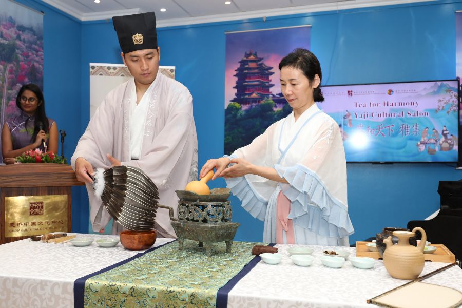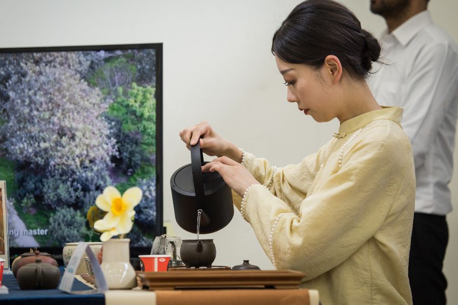 5月16日在尼泊尔加德满都“茶和天下·雅集”活动现场拍摄的茶艺展示。“茶和天下·雅集”活动16日在尼泊尔首都加德满都举办,与会嘉宾强调茶在连通中尼两国中发挥的作用。活动由中国文化和旅游部和中国驻尼泊尔大使馆主办、尼泊尔中国文化中心和江苏省文化和旅游厅承办。(图片来源:新华社)