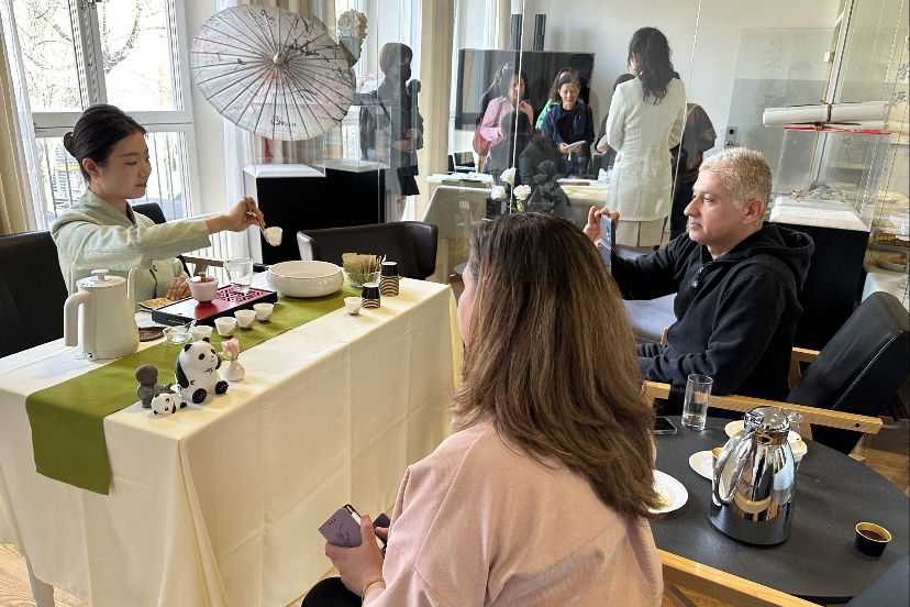 民众在比利时布鲁塞尔的中国文化中心品茗。(图片来源:新华社)