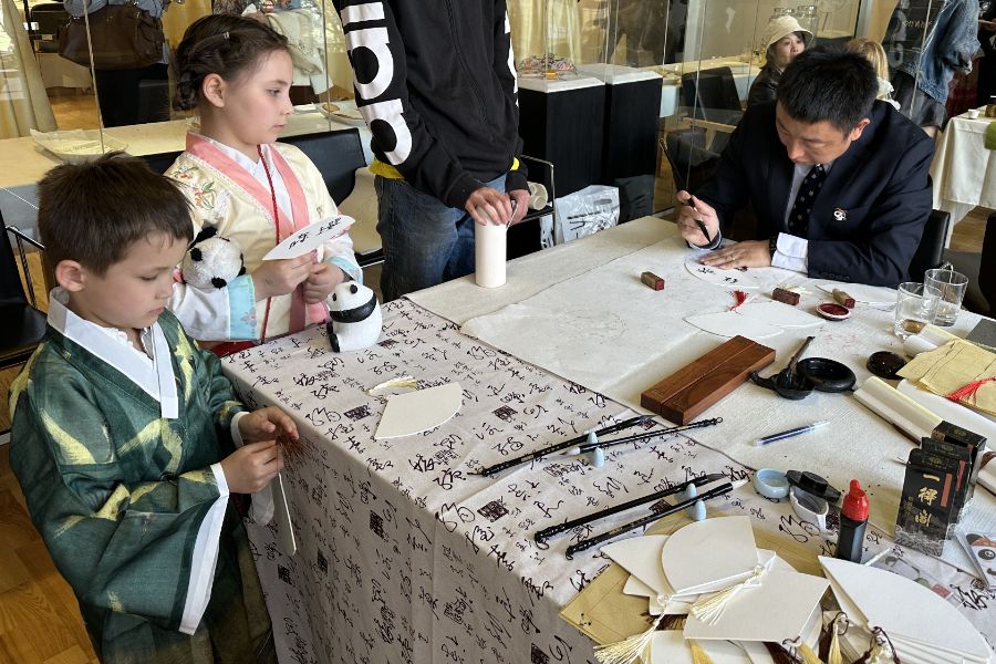 在瑞典首都斯德哥尔摩的中国文化中心,瑞典儿童观看中国书法展示。(图片来源:新华社)
