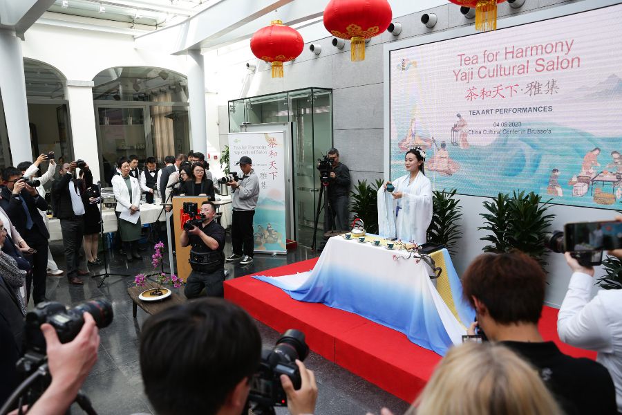 由中国文化和旅游部、中国驻比利时大使馆、中国驻欧盟使团共同举办的“茶和天下·雅集”比利时站活动5月4日在布鲁塞尔中国文化中心开幕。图为民众在比利时布鲁塞尔的中国文化中心观看茶艺表演。(图片来源:新华社)
