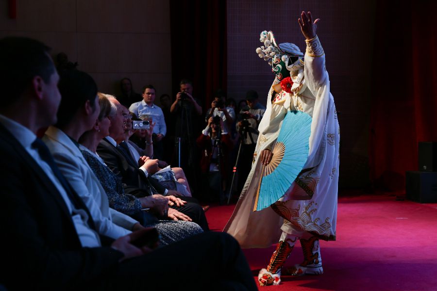 在比利时布鲁塞尔的中国文化中心,演员在“茶和天下·雅集”活动开幕式上表演川剧变脸。(图片来源:新华社)