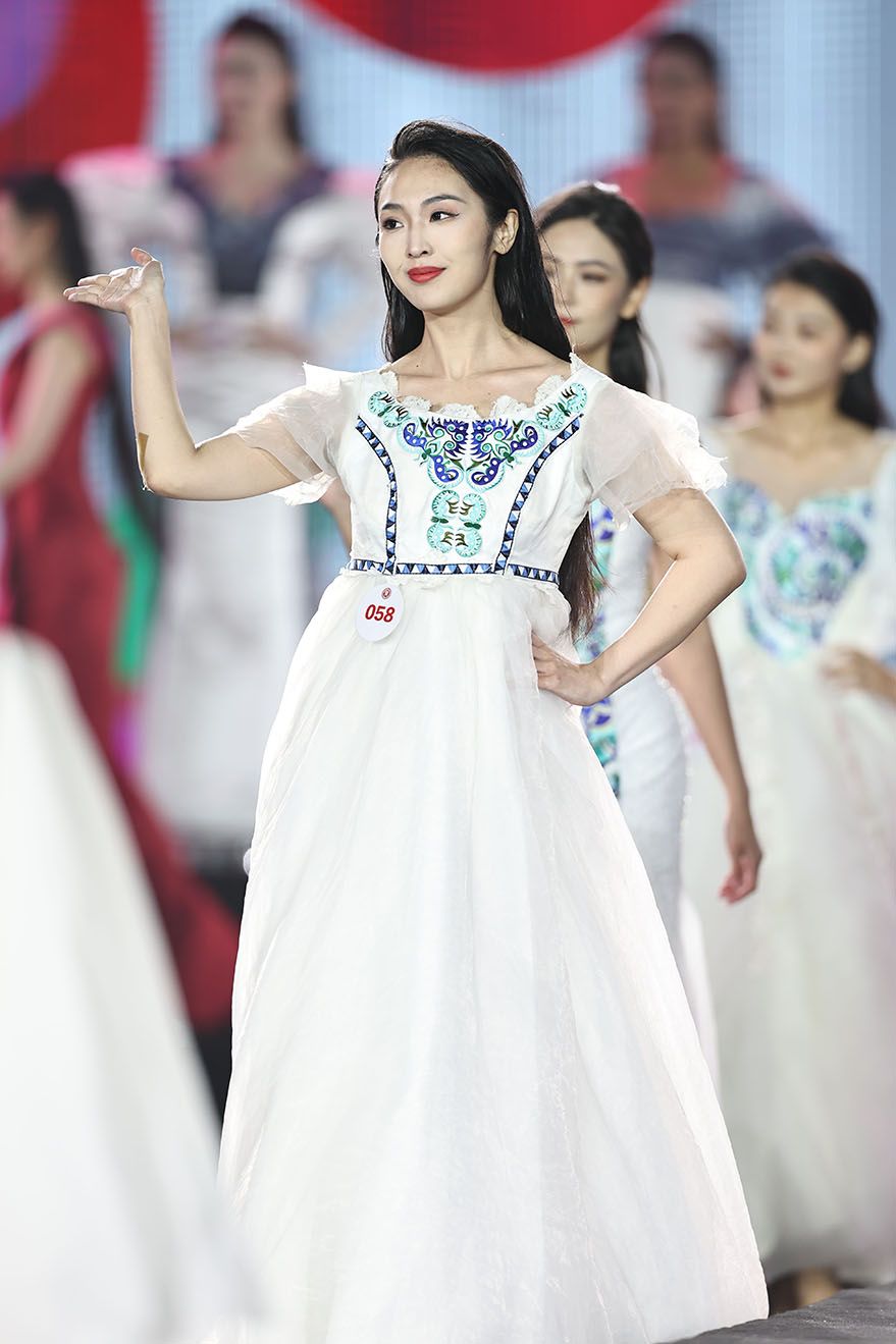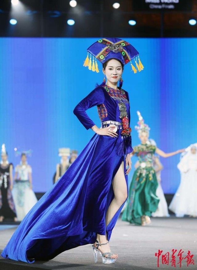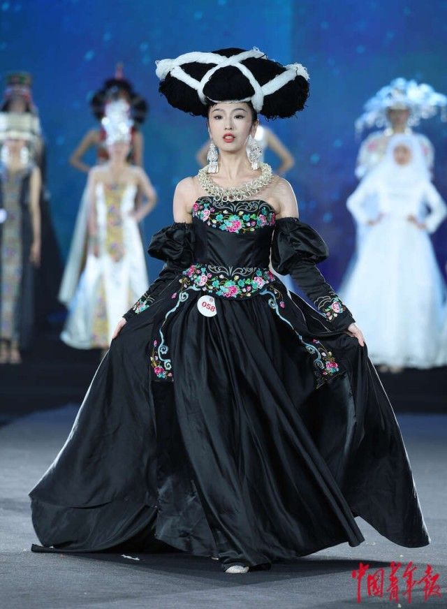 5月19日,第72届世界小姐大赛中国区总决赛现场,毕业于天津工业大学服装表演专业的黑龙江姑娘、58号选手许可昕展示民族服装。(图片来源:《中国青年报》)