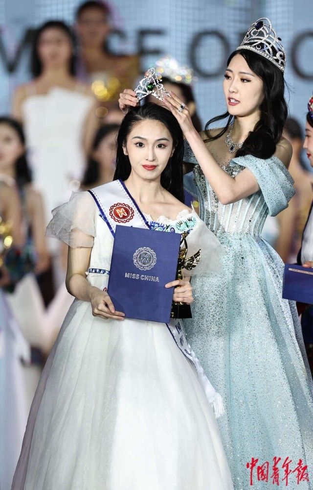 5月19日,第67届世界小姐中国区冠军关思宇(右)为获得第72届世界小姐大赛中国区总决赛中国形象奖的许可昕戴上皇冠。(图片来源:《中国青年报》)