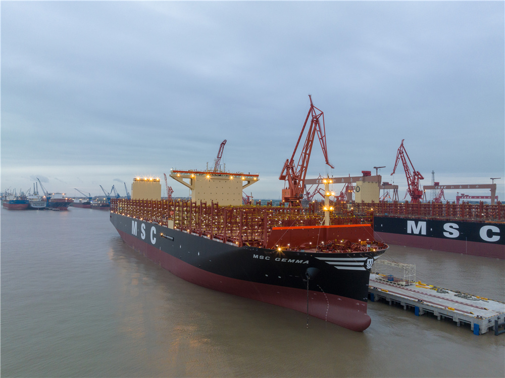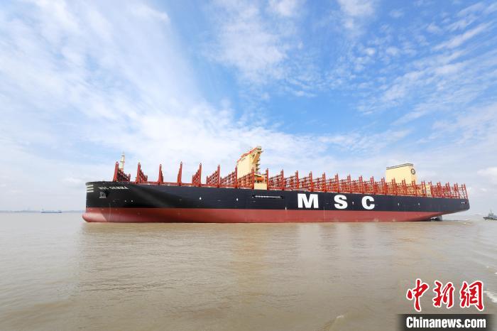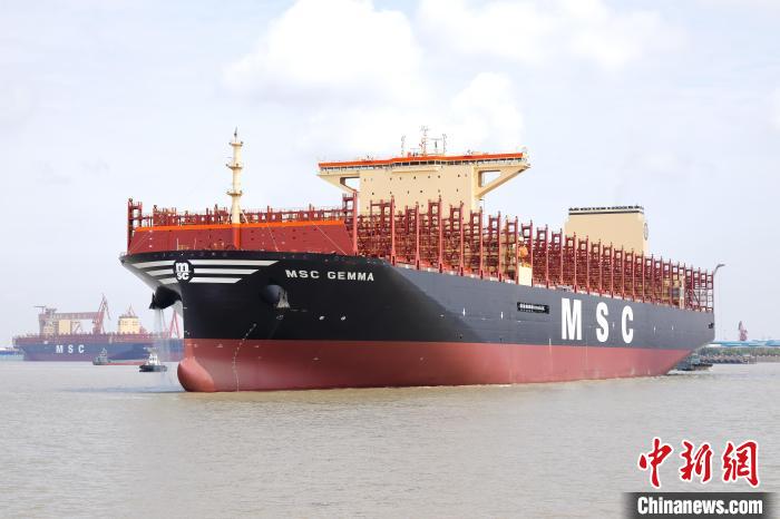 24116TEU超大型集装箱船“地中海 吉玛”号在上海交付。(图片来源:中新网)