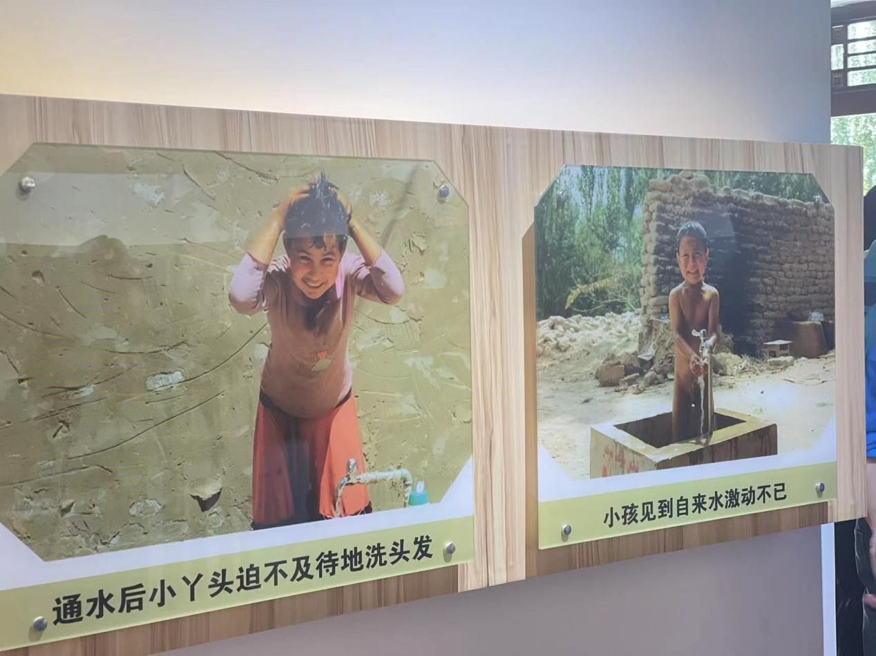 终于,在工作者们坚持不懈的日夜奋战和伽师民众群策群力之下,当地迎来了首次通水。而伽师人喝上自来水的这份喜悦也被记录并保存了下来——展馆展板上所呈现的一张张看见自来水后激动不已的笑脸,以及孩子们迫不及待洗头洗澡的画面,无一不让今天的观展者既觉喜悦,又感心酸。