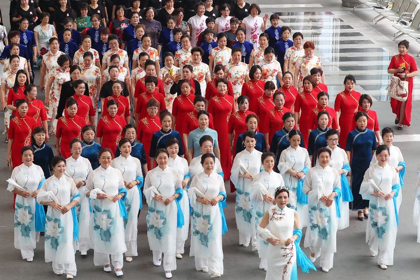 来自江苏各地的1500余位旗袍爱好者身穿各式光彩夺目的旗袍,迈着优雅的步伐穿梭于场馆内外,上演“千人旗袍巡游”。(图片来源:中新社)