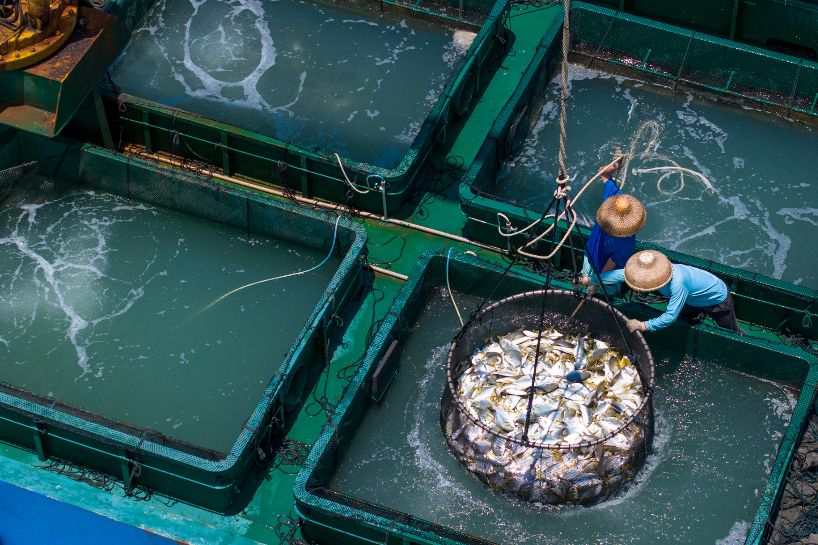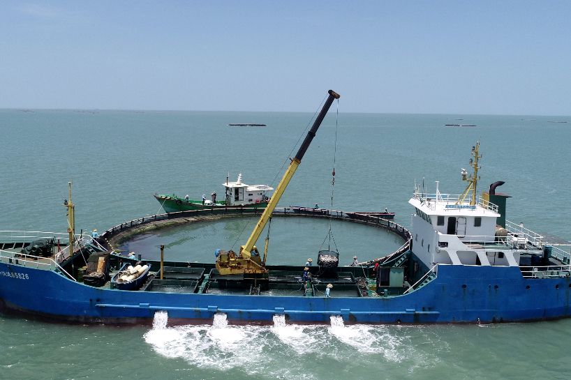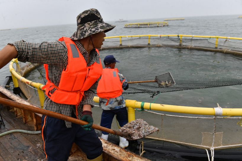 26日,在日照市盛隆水产养殖有限公司海洋牧场,渔民在给网箱内养殖鱼投喂小鱼。