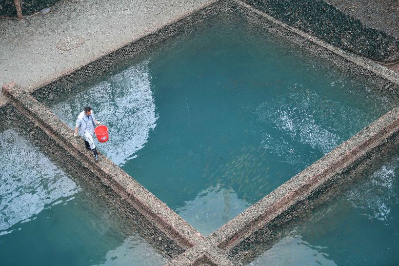 近年来,山东省日照市抢抓海洋牧场发展机遇,赋能渔业养殖高质量发展,已创建国家级海洋牧场示范区8处,省级海洋牧场示范区14处,累计建成网箱数量居全省首位。图为5月26日,在日照市盛隆水产养殖有限公司海洋牧场,渔民在给网箱内的养殖鱼投喂食物。(图片来源:本文图片均综编自新华社)