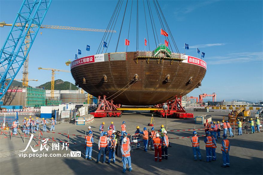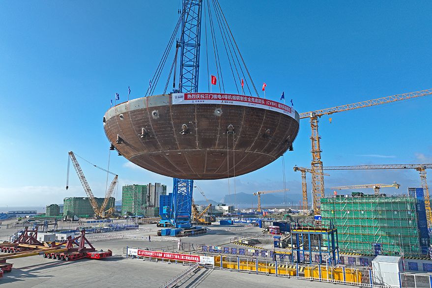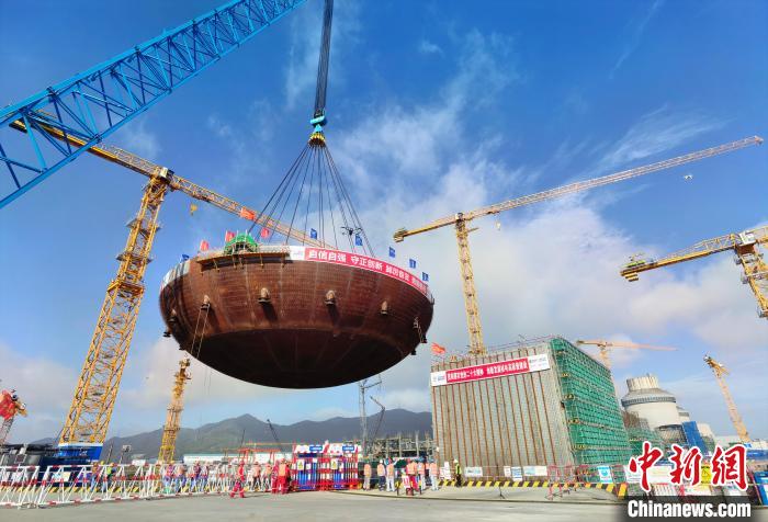 【欧洲时报网】2023年5月29日,在浙江省台州市三门县,中核集团旗下中国核电投资控股的三门核电二期工程4号机组核岛钢制安全壳底封头顺利吊装就位。这是该工程4号机组核岛反应堆厂房吊装的首个大型模块,标志着该厂房主体结构施工开始,为后续关键路径施工创造了条件。