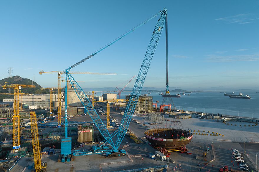 5月29日上午,吊装总指挥部下达指令,2600吨吊车开始起吊,经过试吊、起升、回转、落钩等动作,安全壳底封头准确就位,整个吊装过程安全受控。(图片来源:人民网)