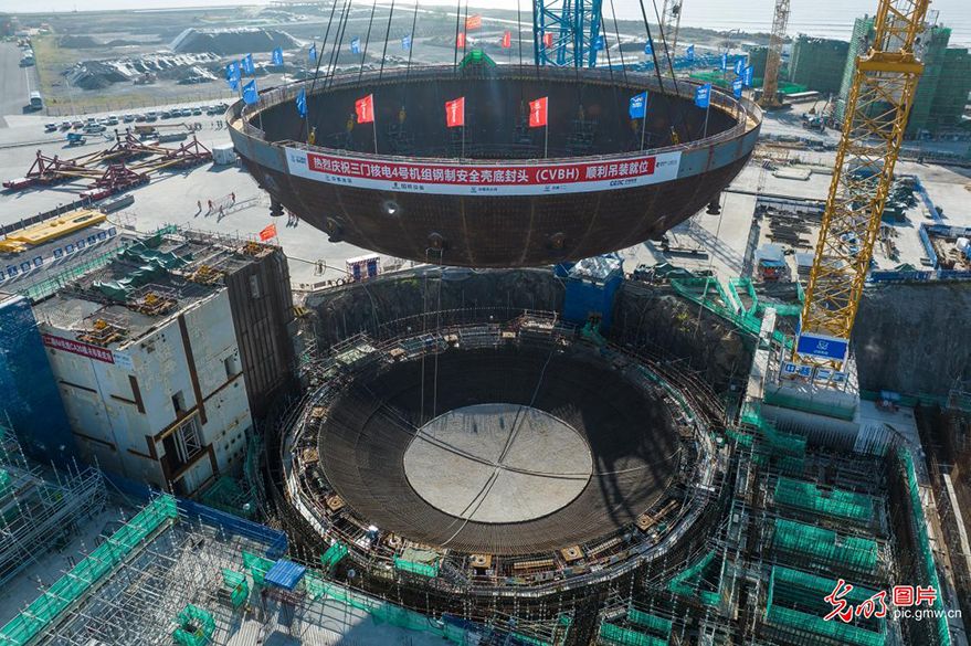 5月29日,在浙江省台州市三门县,三门核电二期工程4号机组核岛钢制安全壳底封头顺利吊装就位。(图片来源:新华社)
