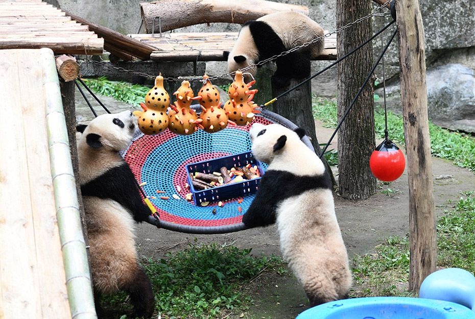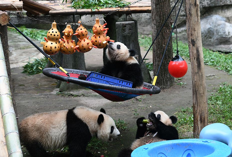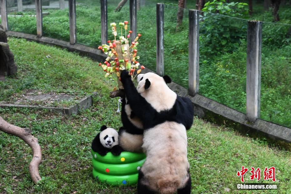 大熊猫吃“冰糖葫芦”过“六一”。(图片来源:中新网)