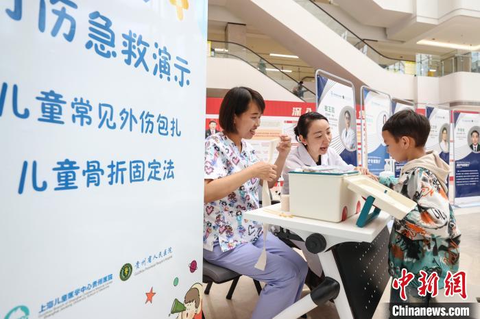 6月1日,位于贵州省贵阳市观山湖区的上海儿童医学中心贵州医院举行儿童节义诊活动,图为一名小朋友在学习儿童常见外伤包扎。(图片来源:中新网)