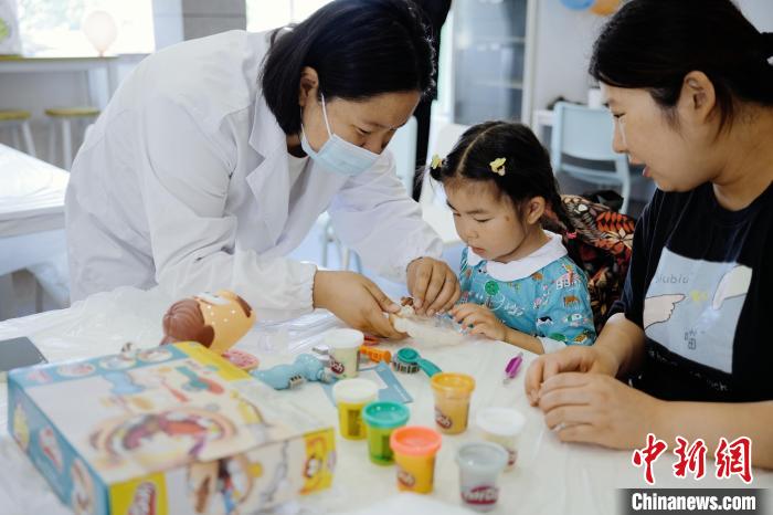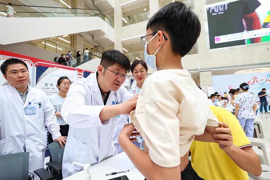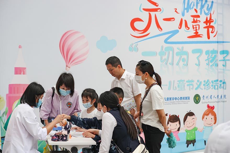 6月1日,位于贵州省贵阳市观山湖区的上海儿童医学中心贵州医院举行儿童节义诊活动,图为儿童胸外科医生在为小朋友义诊。(图片来源:中新社)