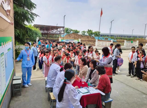 5月31日,河南商水县红十字会、商水县人民医院、汤庄乡人民政府邀请省人民医院志愿服务医疗专家团队和部分县医疗服务志愿者走进商水县汤庄乡西赵桥学校,开展“博爱先锋、红会送医、情满校园”优质服务基层行义诊活动。(图片来源:中国日报网)