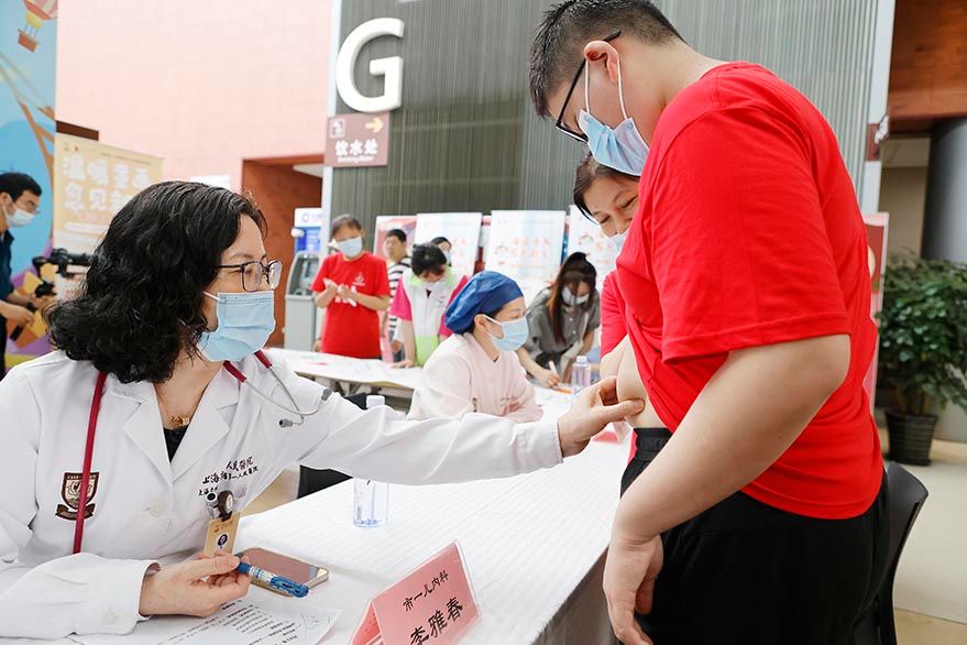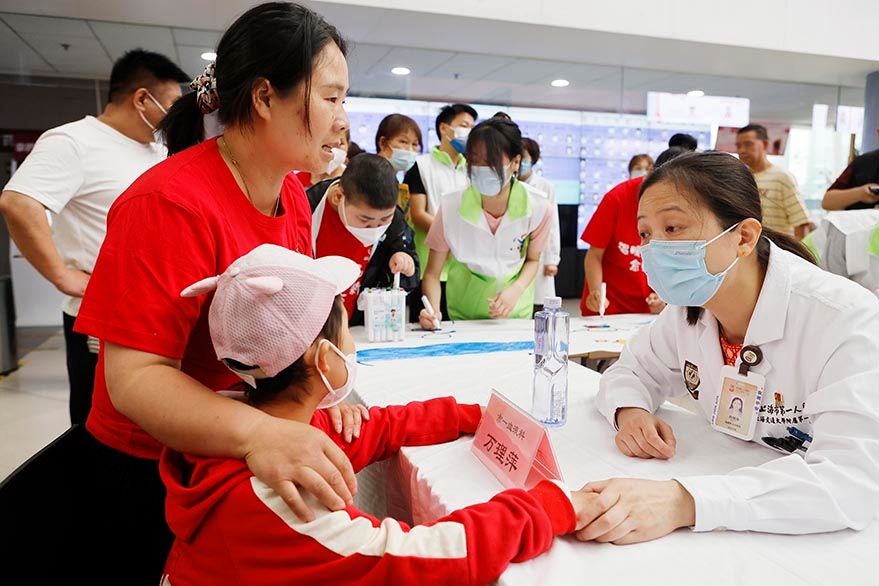 6月1日,上海市第一人民医院青少年血液病救助基金成立两周年公益活动暨专家义诊在上海市人民医院松江院区门诊大厅举行。图为上海市第一人民医院血液科(南院)主任万理萍为孩子义诊。(图片来源:中新社)