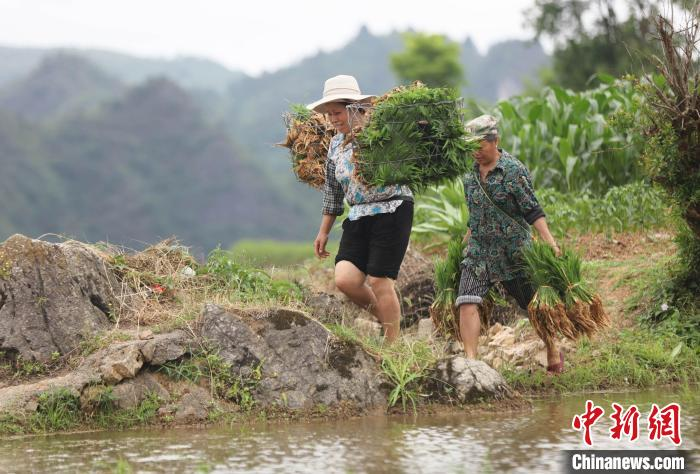 贵州省黔东南苗族侗族自治州施秉县杨柳塘镇翁塘村望江梯田迎来插秧季,村民们抢抓农时移栽水稻秧苗。图为村民在挑运水稻秧苗。(图片来源:中新网)