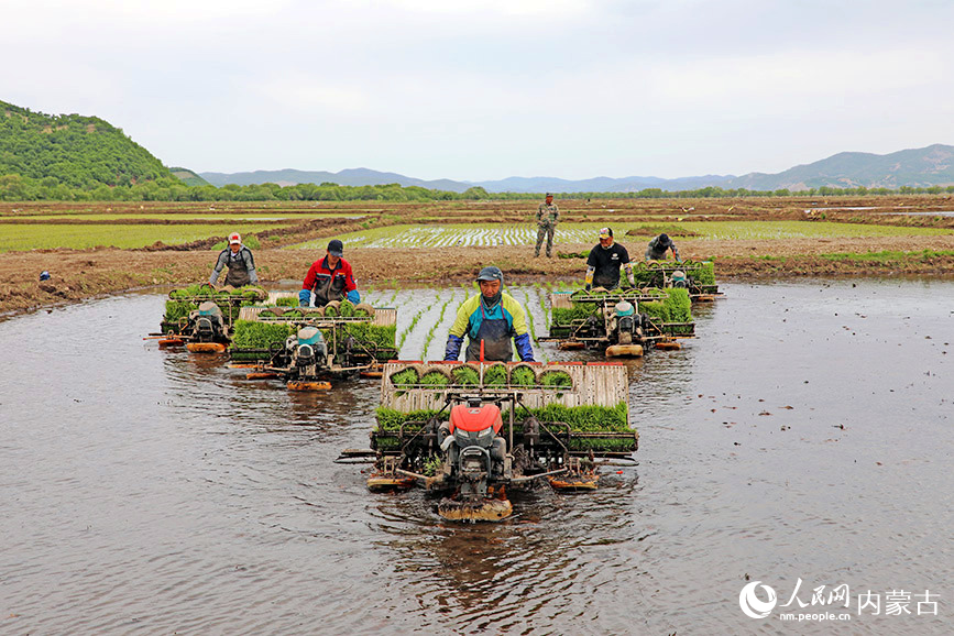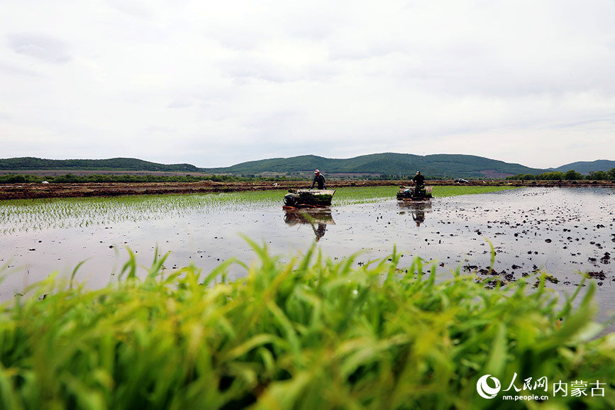 5月31日,农技人员在内蒙古自治区呼伦贝尔农垦扎兰屯农牧场有限公司稻田进行机械化插秧。(图片来源:人民网)