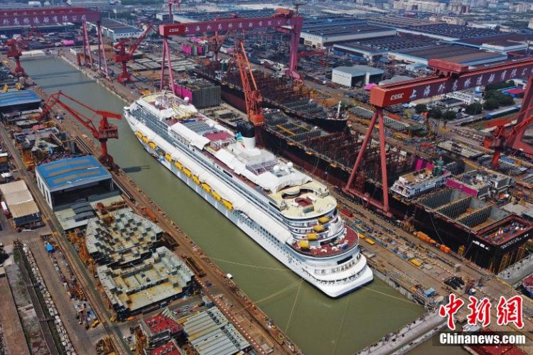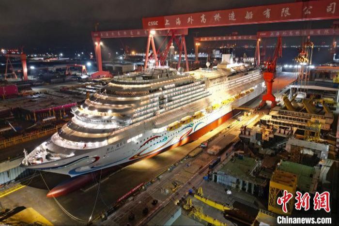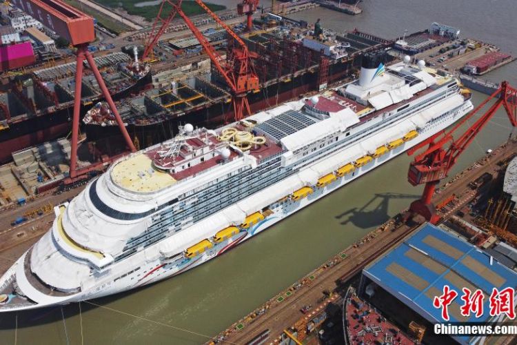 航拍成功起浮的中国首艘国产大型邮轮“爱达·魔都号”。(图片来源:本文图片均综编自中新网)
