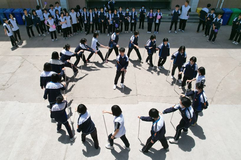 石家庄市第四十五中学,高三学生正在做“无敌风火轮”游戏。(图片来源:中新社)