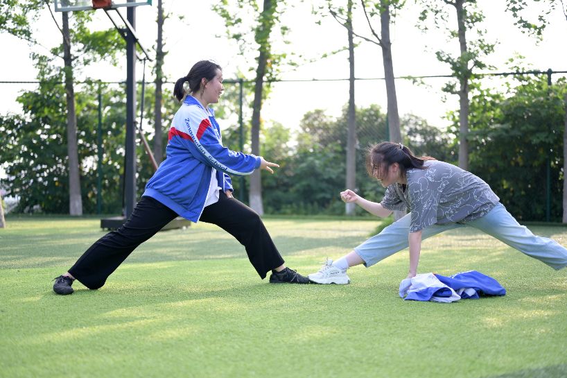 6月2日,河北省石家庄市第四十五中学,高三学生正在做“不倒森林”游戏。(图片来源:中新社)