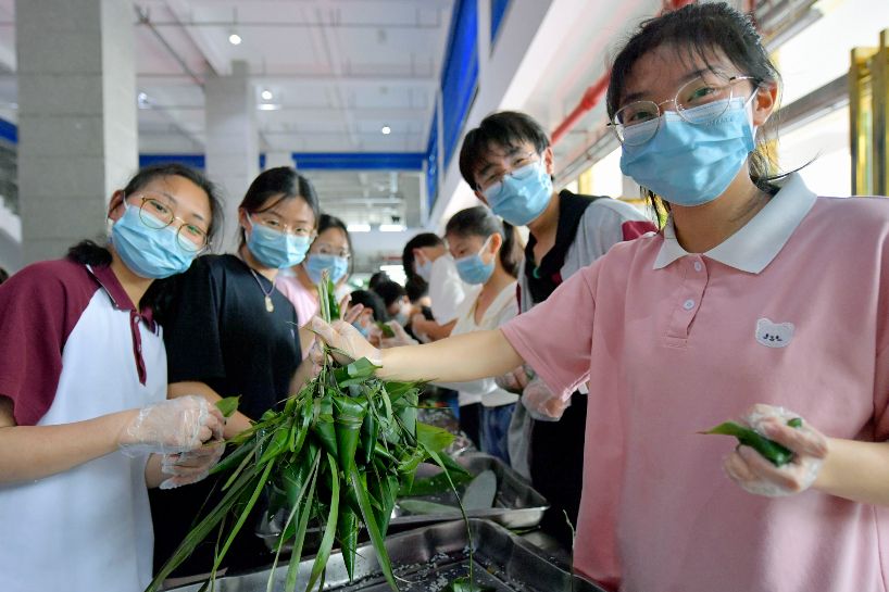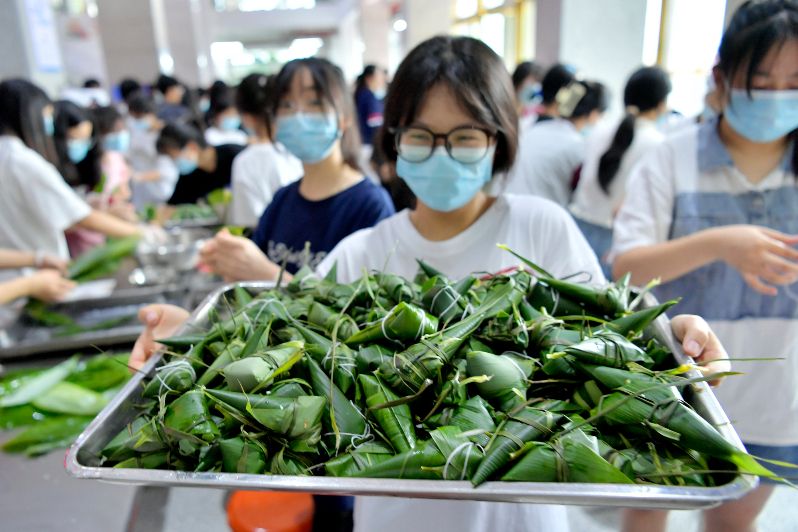 6月4日,湖北省宣恩县一中的高三学生在展示包好的粽子。(图片来源:新华社)