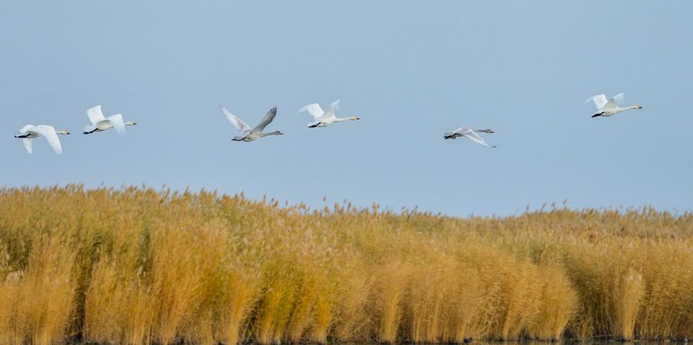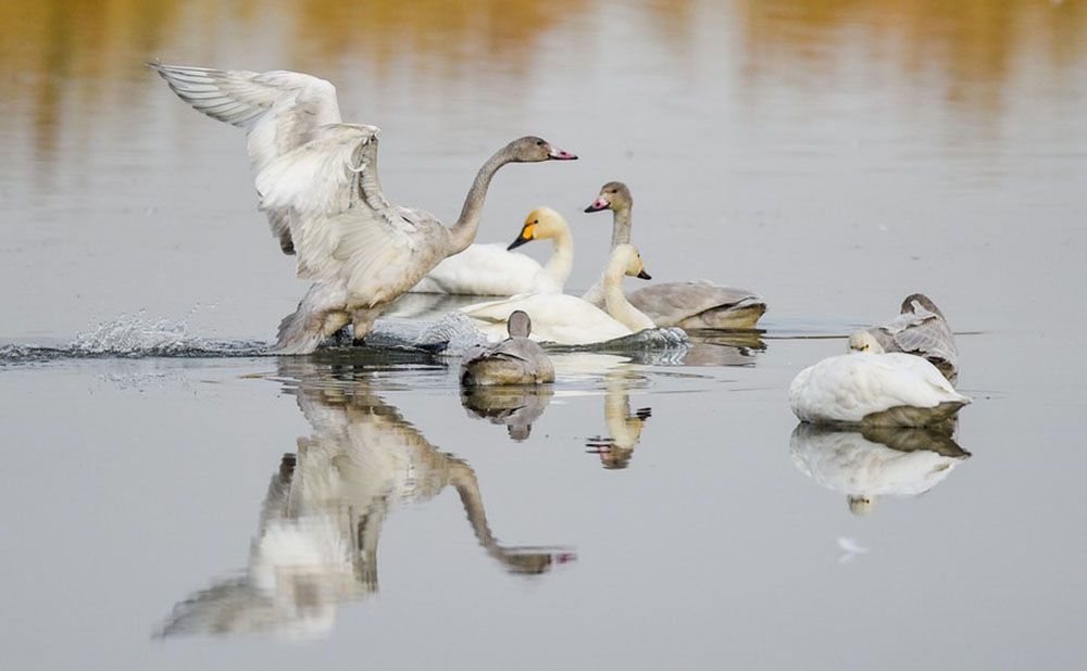 大批向南迁徙的天鹅在位于内蒙古巴彦淖尔市的乌梁素海停留觅食,为秋日的乌梁素海增添了一份灵动。(图片来源:新华社)