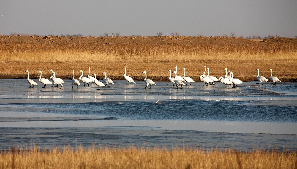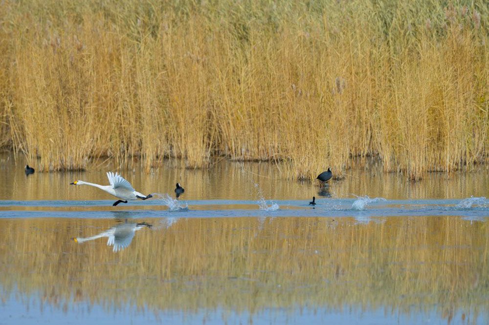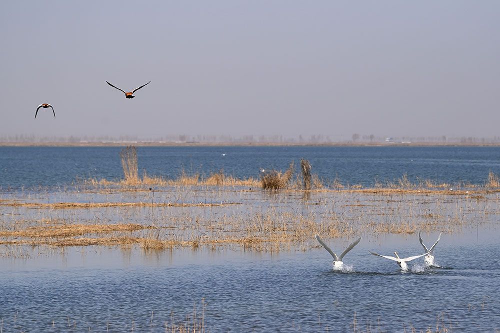 内蒙古巴彦淖尔市乌梁素海湿地,天鹅在这里沐浴春光。(图片来源:中新社)
