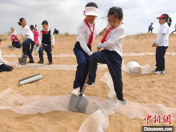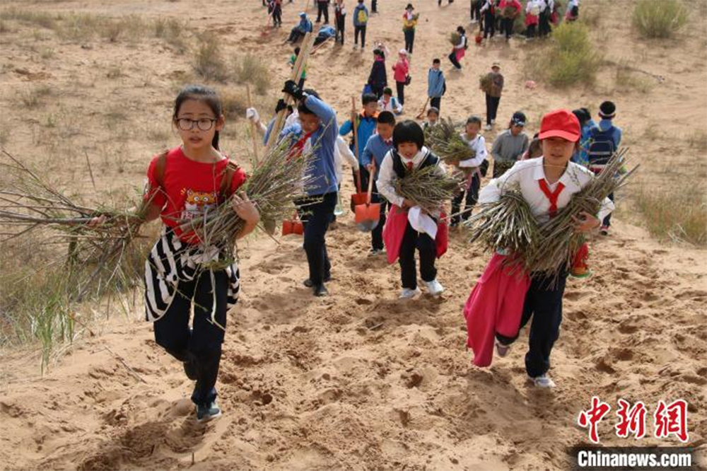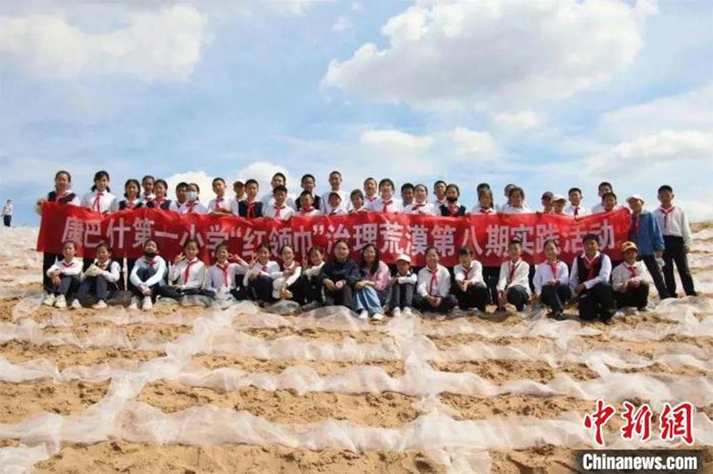 自2019年4月起,每年春秋季节,在这片沙地上,都能看到一群群戴着红领巾的治沙少年。