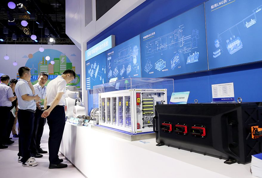 6月11日,参观者在一组船舶低碳/零碳燃料动力系统模型前交流讨论。(图片来源:新华社)