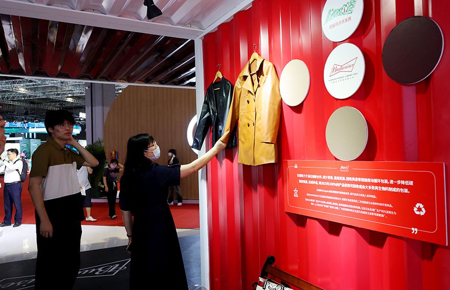 6月11日,参观者在博览会现场用手触摸一件使用废酒糟为原料制作的植物基皮革服装。(图片来源:新华社)