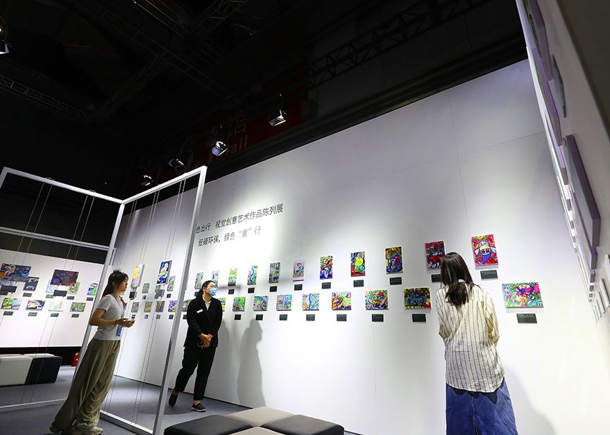 6月11日,参观者在博览会上一个低碳环保主题儿童绘画作品展示区内驻足观看。(图片来源:新华社)