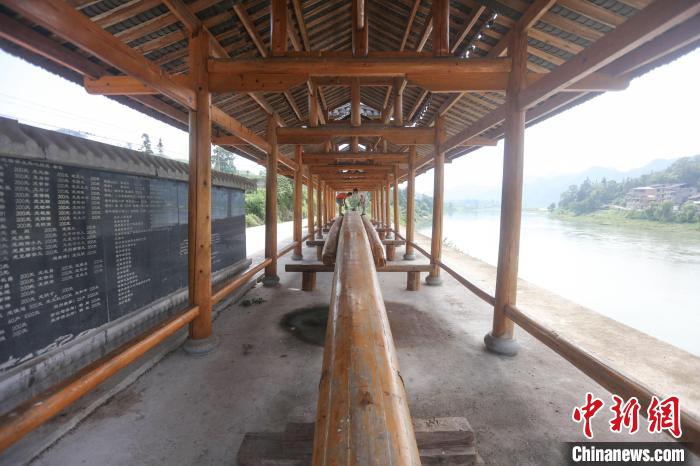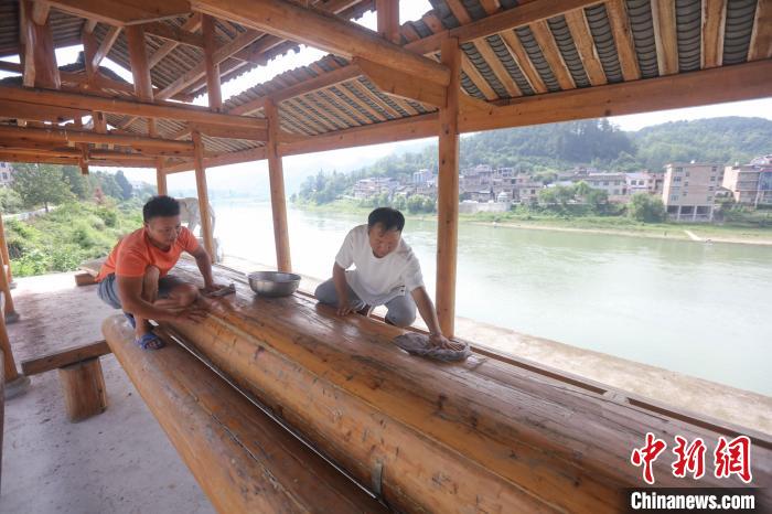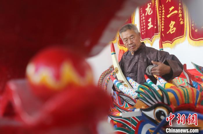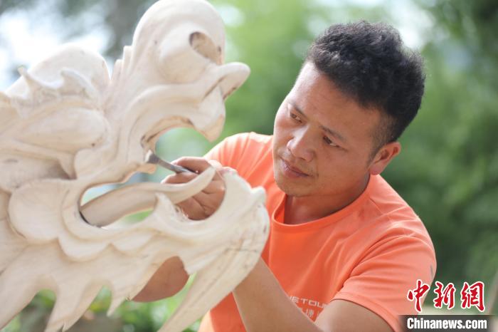 非遗传承人在施秉县双井镇平寨村雕刻独木龙舟龙头。(图片来源:中新网)