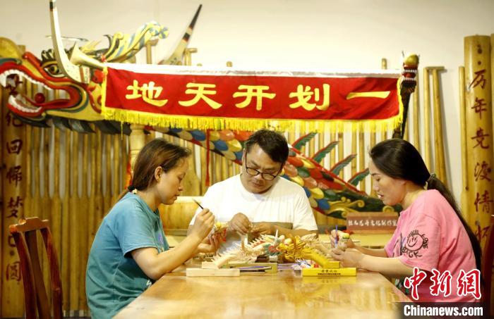 施秉县双井镇独木龙舟展示馆内,传承人与几位同行制作独木龙舟“龙头”小摆件。(图片来源:中新网)