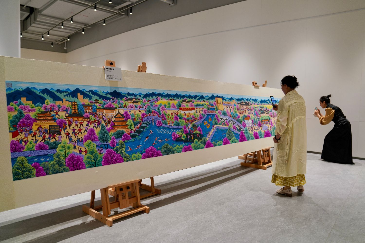 6月13日,“浙里石榴红 共绘亚运梦”民族(农民)画长卷捐赠仪式在位于浙江杭州的杭州亚运会博物馆举行。来自中国知名农民画乡以及浙江对口七省区的民族(农民)画家共同创作亚运题材长卷首次公开亮相,并捐赠给杭州亚组委。图为当日,两位画家观赏、拍摄参展作品。(图片来源:中新社)