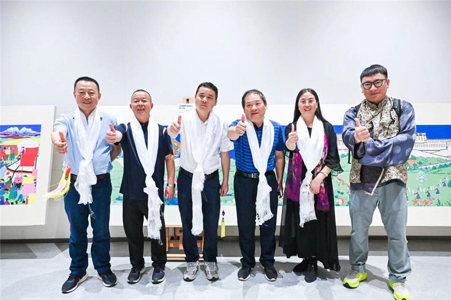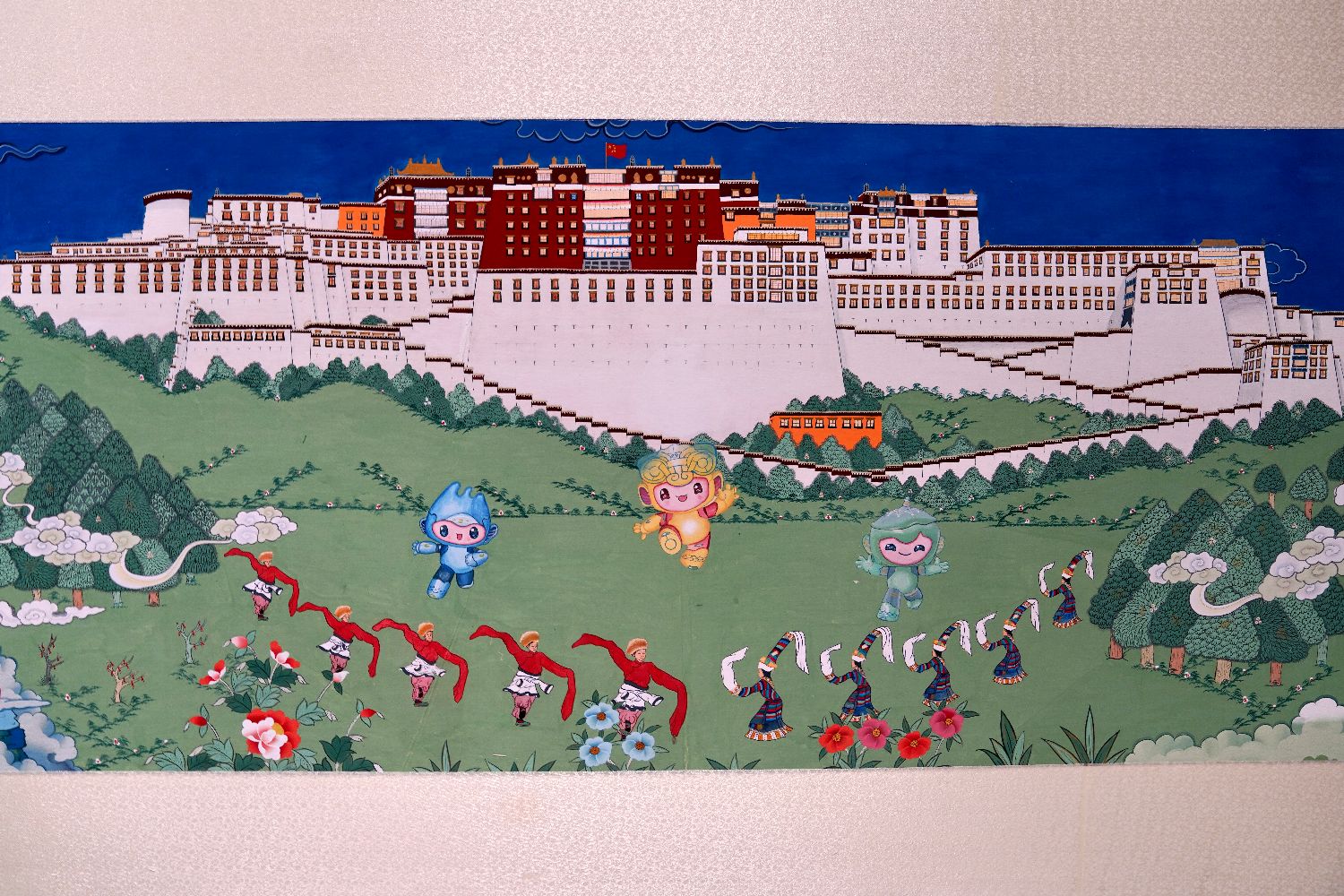 西藏那曲团队创作的《幸福藏家 迎亚运》以青藏高原独特的风景为创作背景,将藏纸唐卡工艺融入吉祥八宝图元素,表达了全体藏族人民对亚运会举办的美好愿望,同时,高速公路、高铁等元素也描绘出了浙江对口援藏的突出成果。(图片来源:中新社)