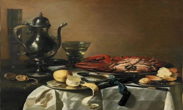而这与西方静物画家彼得·克拉斯笔下的感觉完全不同——餐盘中的螃蟹和龙虾显现出一种“死亡的静穆”。受到荷兰“黄金时代”社会风潮的影响,彼得·克拉斯笔下的静物以“象征”的手法,隐喻生命脆弱短暂,暗含着生与死的哲学思考。