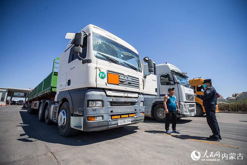 6月14日,二连出入境边防检查站执勤民警查验货车司机通关证件。(图片来源:人民网)