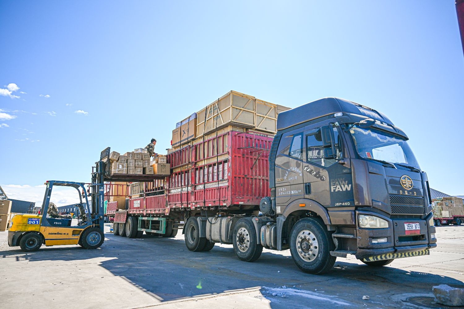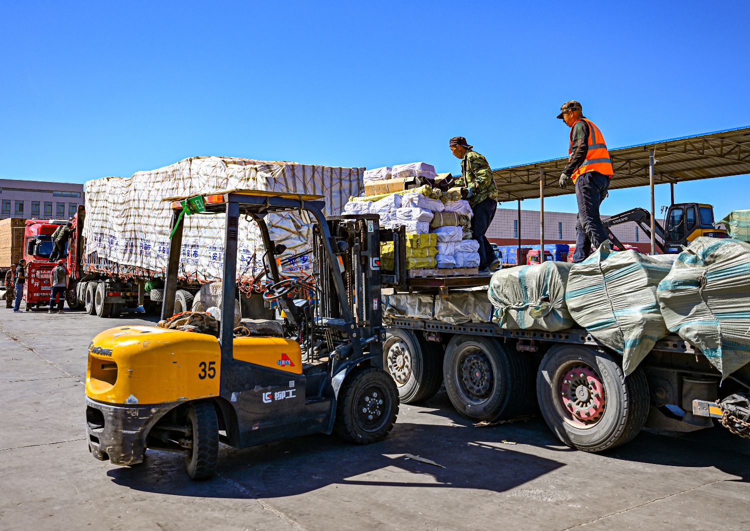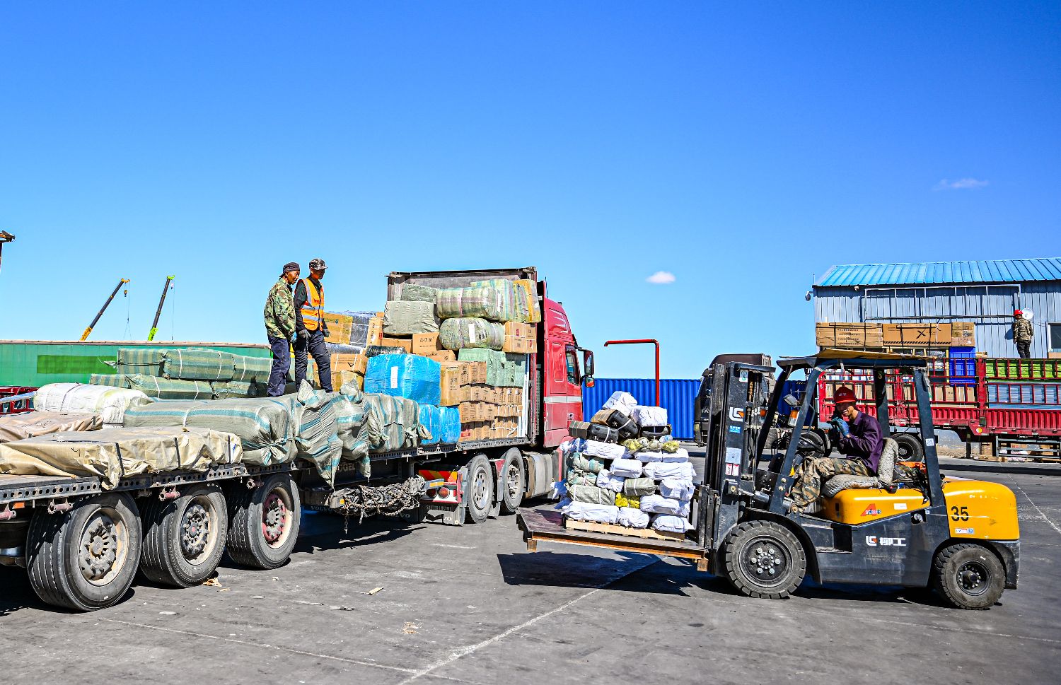 6月11日,工人在二连浩特口岸旁的进出口物流园区中装载准备出口的货物。(图片来源:新华社)