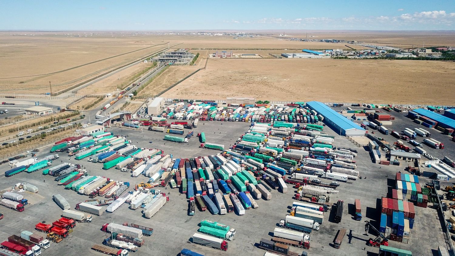 6月11日,二连浩特口岸旁的进出口物流园区中大量货运卡车排队准备出关(无人机照片)。(图片来源:新华社)