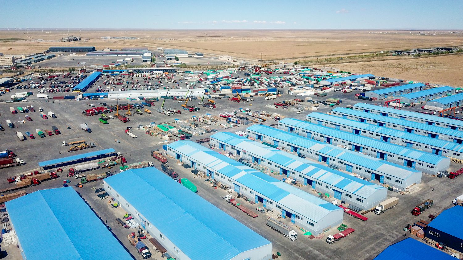 这是6月11日拍摄的二连浩特口岸旁的进出口物流园区中的景观(无人机照片)。(图片来源:新华社)