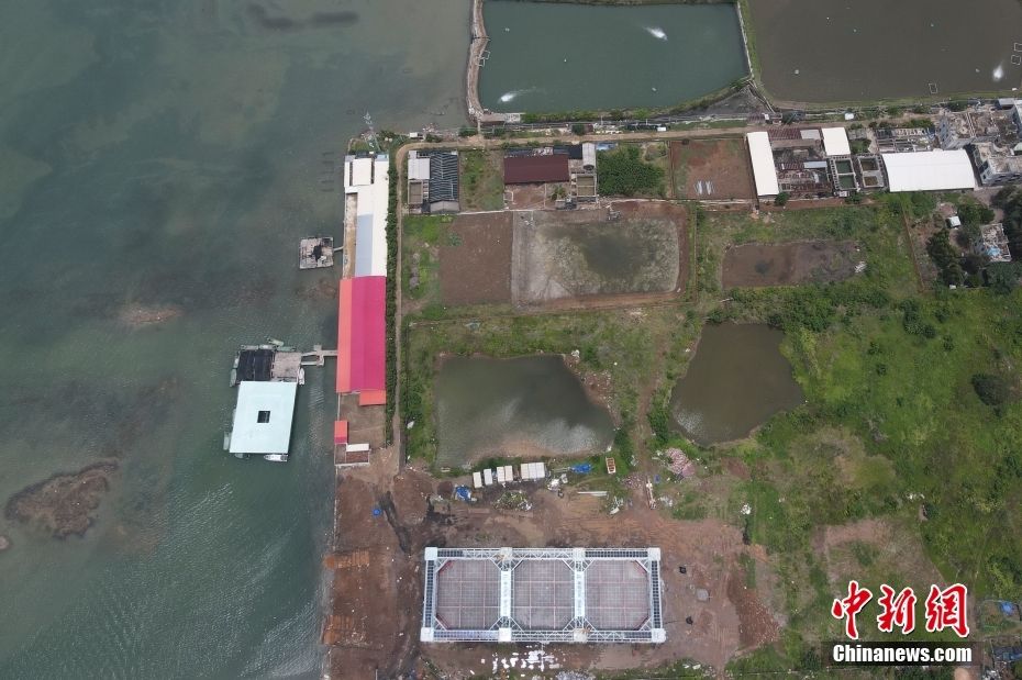6月14日,在广东省湛江市拍摄的即将下水投产的“海威2号”半潜桁架式渔业智能养殖平台(图中底部银色方框)。据介绍,该平台拖航吃水排水量960吨,工作吃水排水量2610吨,设计养殖水体3万立方米,单个养殖周期可收获超100万斤优质深远海养殖鱼类。(图片来源:中新网)