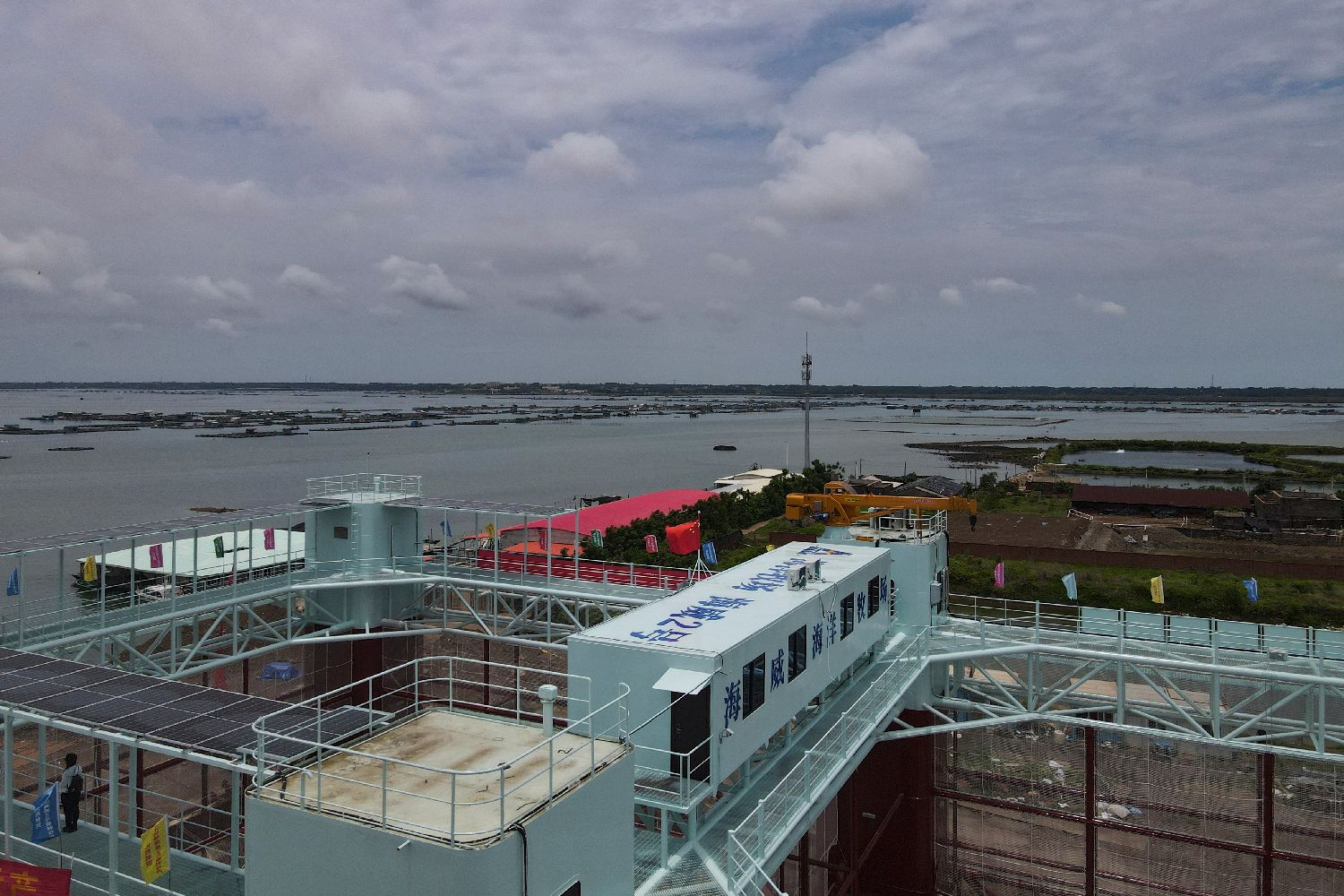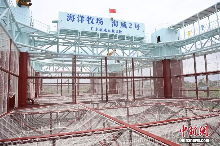 在广东湛江雷州市流沙湾海域,即将下水投产的“海威2号”半潜桁架式渔业智能养殖平台。(图片来源:中新社)